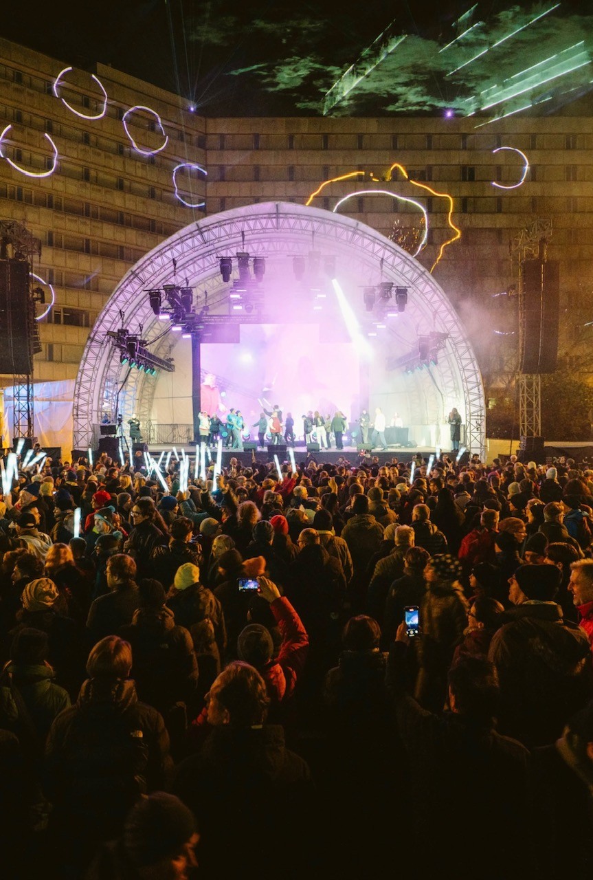 Wir waren um die 130 Freiwillige, die beim letzten Akt vom Bühnenprogramm mitwirkten. Dafür bekamen wir so etwa 50 cm lange Leuchtstäbe, die wir erst einmal unter unseren Jacken versteckten, bevor wir uns im Publikum vor der Bühne verteilten. 20 Uhr begann das Bühnenprogramm neben dem Karl-Marx-Kopf mit Musik von einer Bläsergruppe, die weit oben auf einem Balkon stand. Dann kamen die zwei Geschäftsführer der KuHa auf die Bühne und erzählten von den Höhepunkten des KuHa-Jahres und bedankten sich bei den Chemnitzer Bürgern und den Mitarbeitern. Unser Bürgermeister holte alle 38 Bürgermeister:innen der Kulturhauptstadtregion auf die Bühne und bedankte sich für die großartige Unterstützung und den Zusammenhalt. Jetzt kam unser Einsatz, denn die Tänzer von „Ballroom Bliss“ standen auf der Bühne und das Kommando „Haltet eure Leuchtstäbe in den Himmel von Chemnitz“ ertönte. Es spielte Musik und wir drehten uns um unsere eigene Achse und animierten die Menschen, die um uns herumstanden, zum Mittanzen sie sollten sich um uns drehen. Es entstand ein cooles Miteinander. Auf der gesamten Straße wurde getanzt. Gefühlt tanzte jeder mit jedem und wir Volunteers lagen uns in den Armen und waren glücklich, dass es so ein schöner Abschluss war. Aber wir waren auch traurig, dass nun alles vorbei ist.