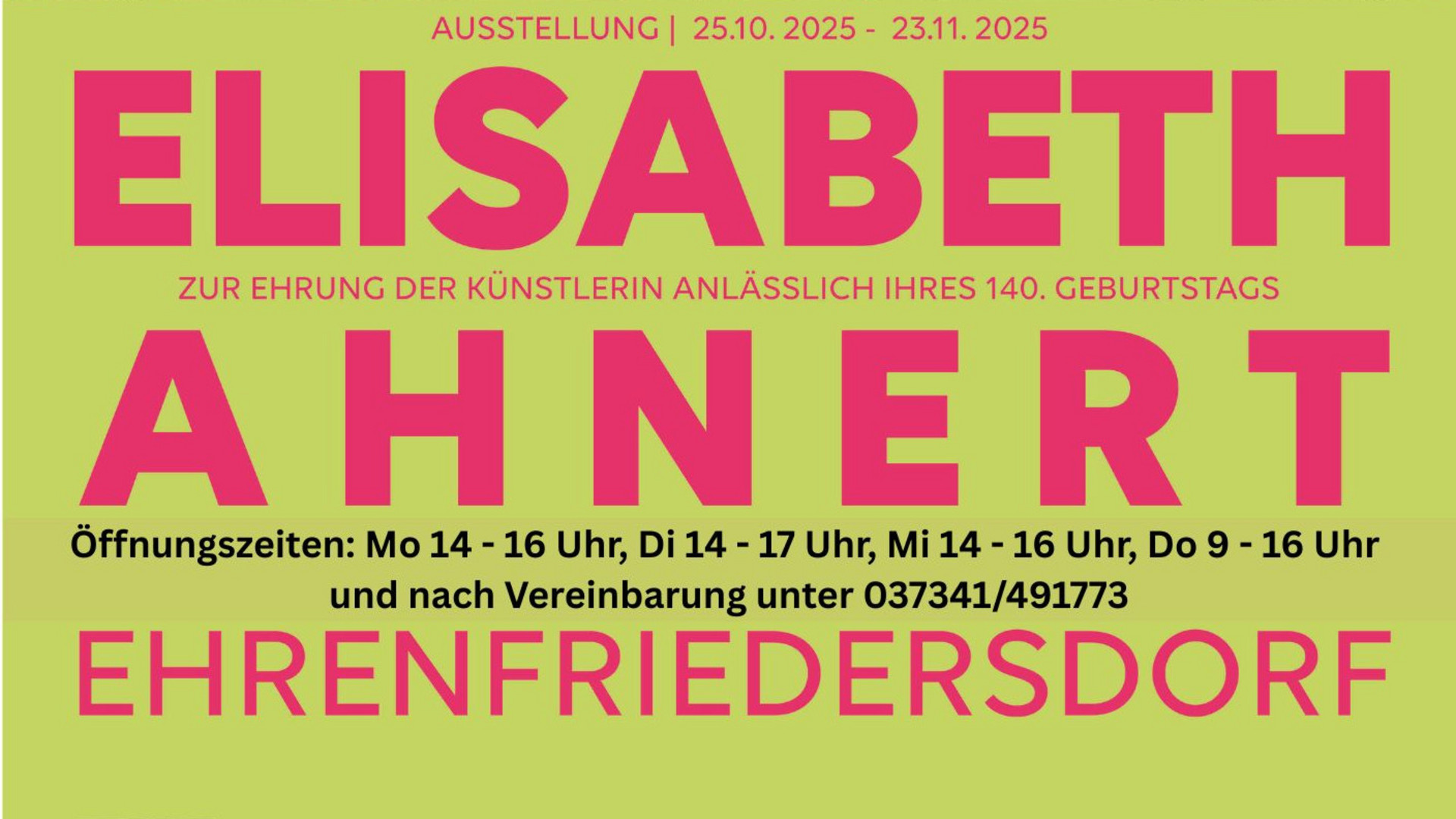 Anlässlich des 140. Geburtstages der in Chemnitz geborenen Künstlerin Elisabeth Ahnert (1885–1966) widmet die Stadt Ehrenfriedersdorf der bedeutenden Vertreterin der klassischen Moderne eine umfassende Ausstellung.