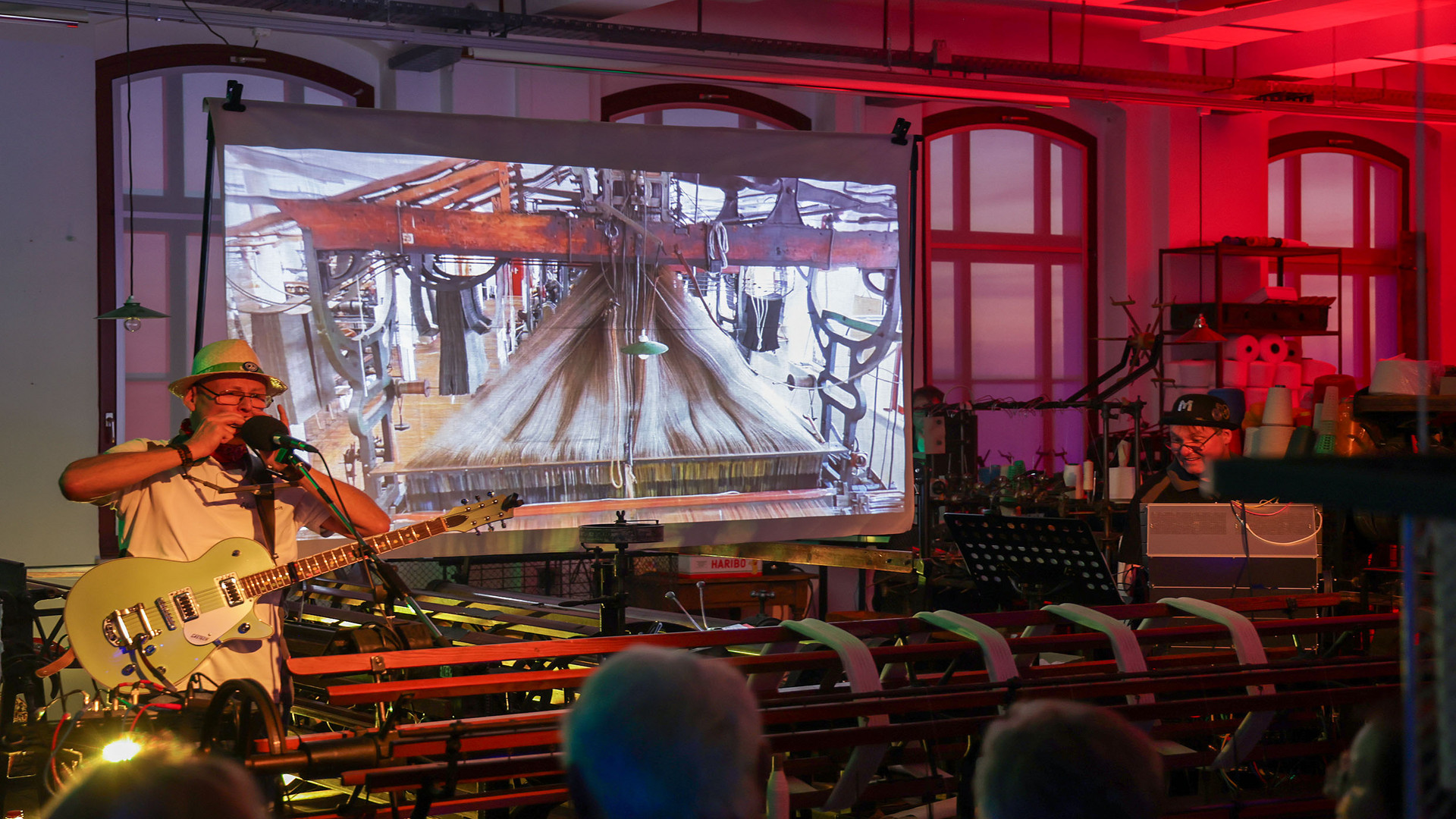 Aus Tonaufnahmen von Webmaschinen entsteht ein akustisches Erlebnis in unserer Schauwerkstatt Jacquardweberei. Verbunden mit musikalischen Elementen aus Rock und Blues erleben sie ein Klangwerk, welches durch eine Licht-Animation ergänzt wird.